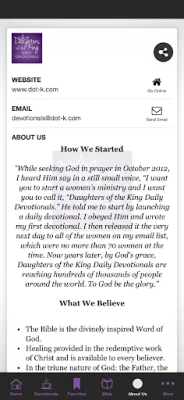 Daughters of the King Daily Devotionals is to inspire women around the world, to pray for revival among us and to encourage unity. Through our daily devotional, we reach hundreds of thousands of readers throughout the world every day and have received countless testimonies of spiritual growth and transformation in the lives of many.