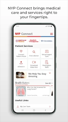 NYP Connect is a health app that brings medical care and services right to your fingertips. NYP Connect connects you with experts from Weill Cornell and Columbia, 7 days a week, for health needs such as virtual urgent care, video visits with physicians, medical chart and record information, and more all on your mobile or tablet device.