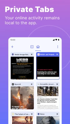 Private Tabs: Securely open and manage multiple private tabs.
