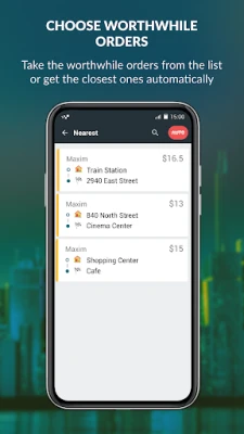 Filter orders by rate and destination to select the most suitable orders for you from the list. Alternatively, you can enable a mode in which our service offers you the nearest orders automatically, allowing you to complete them one by one. This lets you earn more while spending less time and fuel.