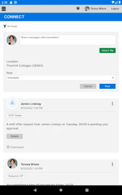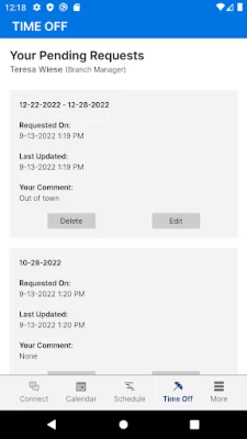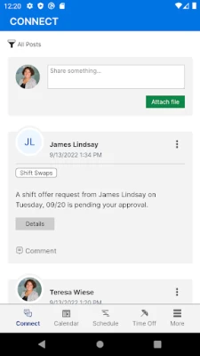 Users can: View daily schedules for all employees from the Branch Schedule report View employee monthly calendars from the Connect Calendar Employees can submit their time off requests and unavailability preferences Employees can swap and offer shifts Managers can review and respond to all employee requests